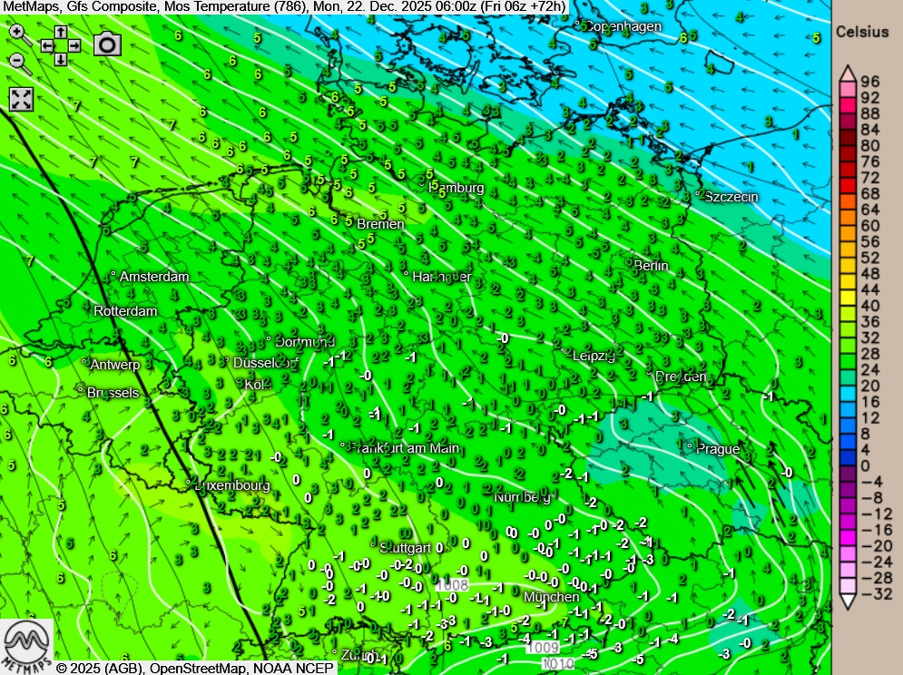 Die Strömungs- / Temperaturkarte sowie die Wetterkarte für Montagfrüh (06:00 Uhr) nach GFS: