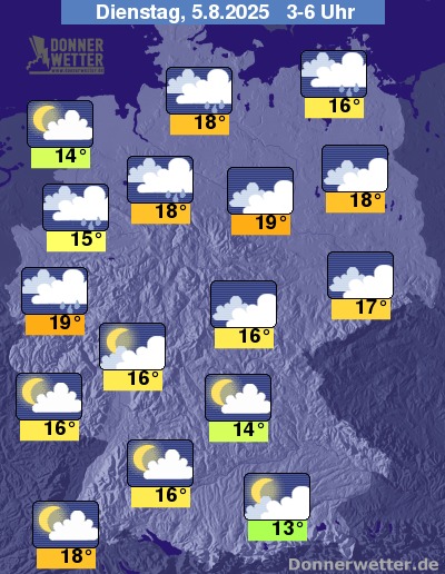 In der Nacht zum Dienstag zieht ein Regenband mit zeitweiligem Regen von Nordwesten her weiter und erstreckt sich am Morgen etwa von West-, über die Mitte- bis nach Ostdeutschland. Im übrigen Bundesgebiet ist es meist locker bis aufgelockert bewölkt und dazu trocken. Die Temperatur sinkt auf 19 Grad in Bonn und bis 13 Grad in Augsburg.