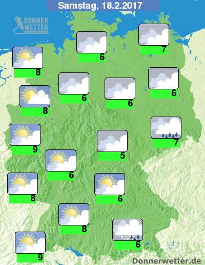 Am Samstag ist es im Südwesten und Nordwesten des Landes oft heiter oder aufgelockert bewölkt, auch im Westen lässt sich zwischen den Wolken hier und da die Sonne blicken. Im übrigen Bundesgebiet ist es hingegen häufig stark und zur zum Teil auch aufgelockert bewölkt, jedoch weitgehend trocken. Die Temperatur steigt auf 5 Grad im Thüringer Becken und bis 9 Grad am Oberrhein.