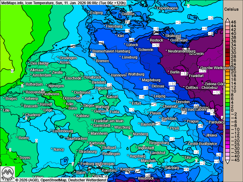 Hier die Temperaturkarte für den kommenden Sonntag (06:00 Uhr):