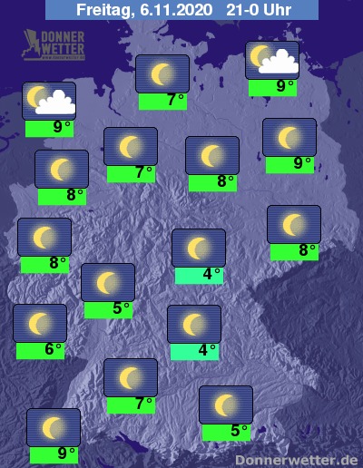 Bis Mitternacht lösen sich die meisten Wolken auch im Norden auf, sonst leuchten verbreitet Mond und Sterne.