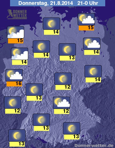 Heute Abend zeigt sich der Himmel größtenteils aufgelockert bewölkt oder sternenklar. Gebietsweise dichte Wolken ziehen über die Regionen an den Küsten und über das westliche Niedersachsen, hier ist vereinzelt auch mal ein Schauer möglich, sonst bleibt es deutschlandweit jedoch weitgehend trocken. Die Abendtemperatur liegt bei 16 Grad in der Kölner Bucht und 12 Grad an der Fränkischen Alb.
