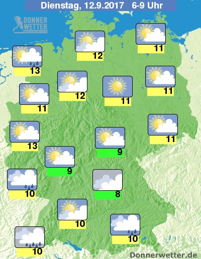 Die Temperaturen liegen bei Werten um 14 Grad C in Ostfriesland und um 8 Grad C in den Höhenzügen der Mittelgebirge.