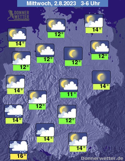 In der Nacht zum Mittwoch zeigt sich der Himmel zunächst verbreitet nur locker bewölkt oder sternenklar, lediglich im Alpenvorland können dichtere Wolken noch örtlich Schauer bringen. In der zweiten Nachthälfte zieht es sich von Südwesten dann wieder zu und gegen Morgen setzt zunächst im Südwesten und nachfolgend über der Südwesthälfte Regen ein. Weiter nach Nordosten bleibt es weitgehend trocken. Die Temperatur sinkt auf 16 Grad in Freiburg und bis 11 Grad in Jena.
