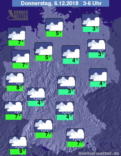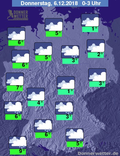 In der Nacht zeigt sich der Himmel bundesweit stark bewölkt oder bedeckt. Nördlich der Teutoburger Walds bleibt es in den kommenden Stunden meist trocken; im Süden setzen zunächst flächendeckend Schauer ein, die im weiteren Verlauf auch in kräftigen Regen übergehen können.