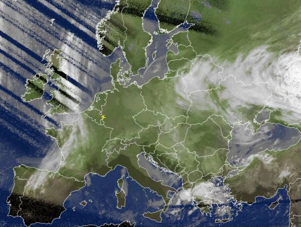 Auf dem Satellitenfoto von heute Morgen sind die oft dichten Wolken dreier Tiefdruckzonen über Europa erkennbar. Eine langgestrecktes Tiefdruckband reicht dabei von den Britischen Inseln über Frankreich bis in den Norden