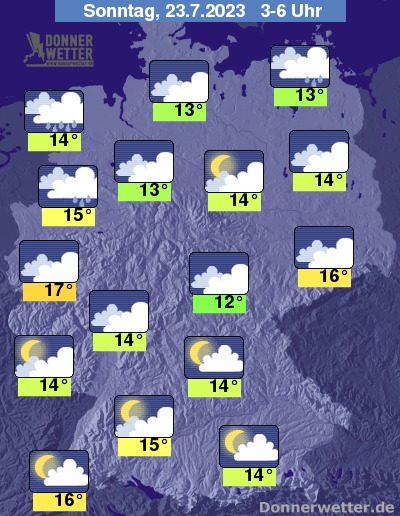 In der Nacht zum Sonntag ist der Himmel im Süden oft locker bis wechselnd, in der breiten Landesmitte meist aufgelockert bis stark und im Norden verbreitet dicht bewölkt, hier zieht in der Nacht auch Regen durch. Im übrigen Land bleibt es trocken bei Tiefstwerten von 17 Grad in Köln und bis 12 Grad in Jena.