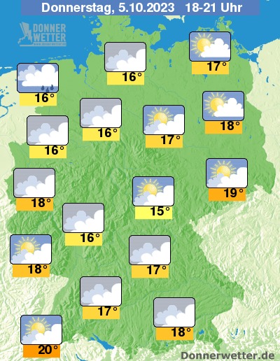 Heute Abend ist es oft stark, teils aufgelockert bewölkt. Im Nordosten heitert der Himmel verbreitet auf. Im nordwestlichen Niedersachsen bilden sich gebietsweise Schauer, während es sonst weitgehend trocken bleibt. Die Temperatur liegt bei 15 Grad in Erfurt und bis 20 Grad in Freiburg.