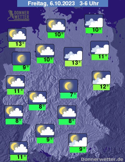 In der Nacht zum Freitag halten sich vor allem im Nordosten und Osten noch oft dichte Wolken, sonst lockert oder klart der Himmel verbreitet auf. Es bleibt trocken bei Tiefstwerten von 13 Grad in Magdeburg und 7 Grad in Erfurt.