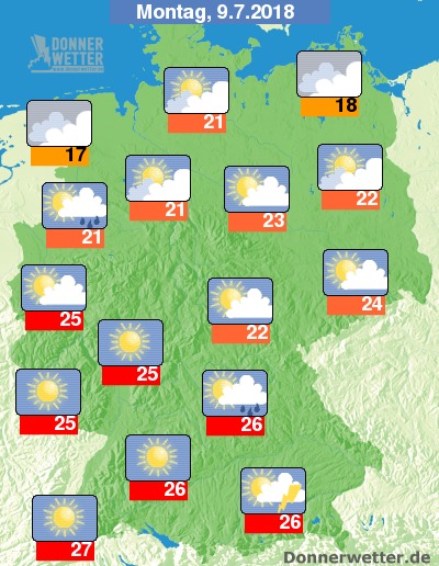 Zum Start in die Woche ist es noch oft heiter bis sonnig und trocken. Im Norden ist es bereits zum Start in den Tag meist stark bewölkt, dazu jedoch größtenteils trocken. Die oft dichten Wolken breiten sich bis zum Abend etwa über die gesamte Nordhälfte des Landes aus. Über Bayern bilden sich lokale Schauer und Gewitter, sonst bleibt es bei häufigem Sonnenschein weitgehend trocken. Die Temperatur erreicht 17 Grad an der Nordsee und bis 27 Grad im Breisgau.