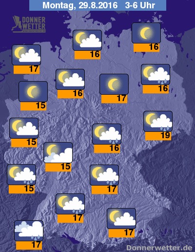 In der bevorstehenden Nacht bilden sich besonders über der Südosthälfte gebietsweise kräftige Schauer und Gewitter, häufig ist es hier aber auch nur leicht oder aufgelockert bewölkt. Weiter nach Nordwesten hin zeigt sich der Himmel hingegen überwiegend locker bewölkt oder sternenklar und es bleibt weitgehend trocken. Die Temperatur sinkt auf 19 Grad in Dresden und bis etwa 15 Grad im Saargau.