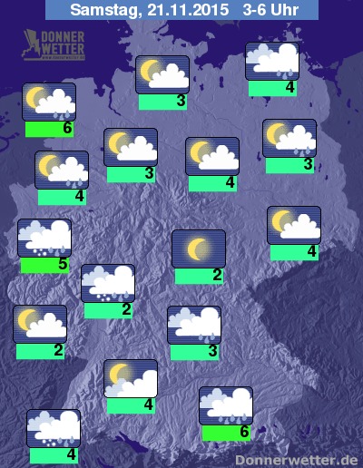 In der folgenden Nacht bleibt es sowohl im Süden als auch im Nordosten Deutschlands bei weitgehend dichter Bewölkung, dazu fällt hier zeitweise Regen, örtlich ist auch Schneeregen möglich. Im übrigen Bundesgebiet ist es teils klar, zum Teil ziehen aber auch mal dichte Wolken durch und es können sich einzelne, hier und da auch mit Schnee vermischte Schauer bilden. Die Temperatur sinkt auf 6 Grad in Ostfriesland und bis 2 Grad am Westerwald.
