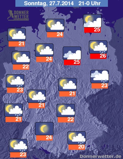 Heute Abend bilden sich vor allem von der breiten Mitte bis ins südliche Deutschland gebietsweise Schauer und Gewitter. Im Norden ziehen ebenfalls meist viele Wolken durch, aber hier entwickeln sich nur selten Schauer und Gewitter. Die Abendwerte liegen bei schwülwarmen 26 Grad in Berlin und immer noch warmen 20 Grad am Starnberger See.