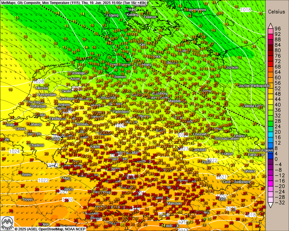 Die Temperaturen erreichen heute bei frischem Seewind im Norden Höchstwerte von teils nur 16 bis 17 Grad, die höchsten Temperaturen werden mit 29 Grad am Oberrhein erreicht.