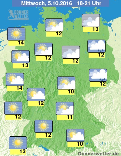 Die Temperaturen erstrecken sich von Werten um die 10 Grad C in München auf 14 Grad C in Ostfriesland.