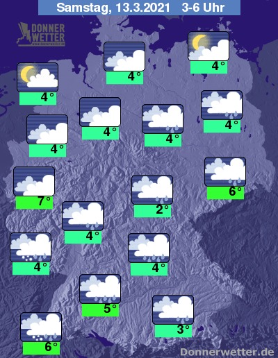 In der Nacht auf Samstag bleibt der Himmel überwiegend bedeckt, temporäre Auflockerungen beschränken sich vor allem auf das Umfeld der Küsten sowie den Alpenrand. Verbreitet muss in den Stunden nach Mitternacht mit Schauern gerechnet werden, in den frühen Morgenstunden trocknet es im Nordwesten dann kurzzeitig auch mal ab. Ab 600 bis 800 Meter können im Bergland auch Schneeregen- oder Schneeschauer fallen.