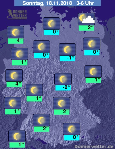 In der Nacht zum Sonntag bleibt der Himmel verbreitet sternenklar, lediglich über dem Nordosten ziehen einige Wolkenfelder durch, es bleibt aber landesweit trocken. Die Temperatur sinkt bis zum Morgen auf Werte zwischen 4 Grad im Rheinland und bis -2 Grad im Vogtland.