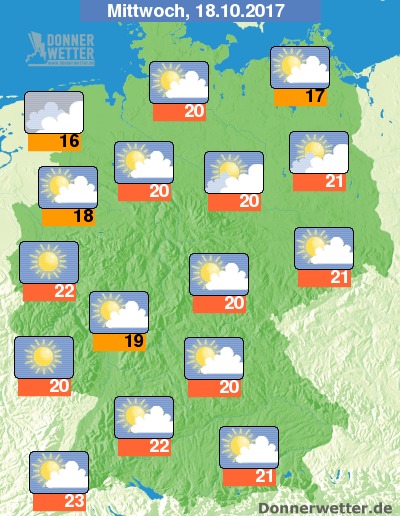 Am Mittwoch ist es im Küstenumfeld oft stark, vor allem im Ostseeumfeld aber auch oft locker bewölkt, dazu bleibt es trocken. Im großen Rest des Bundesgebiets bleibt es überwiegend heiter bis sonnig, hier und da ziehen auch mal mehr Wolken durch, es bleibt aber trocken. Die Temperatur steigt auf 16 bis 23 Grad.