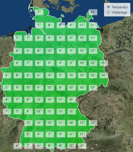 Die Temperaturen gehen dabei im Westen unter aufklarendem Himmel zurück auf Werte zwischen 4 und 8 Grad, im Osten bleibt es mit 10 bis 15 Grad hingegen wesentlich milder.
