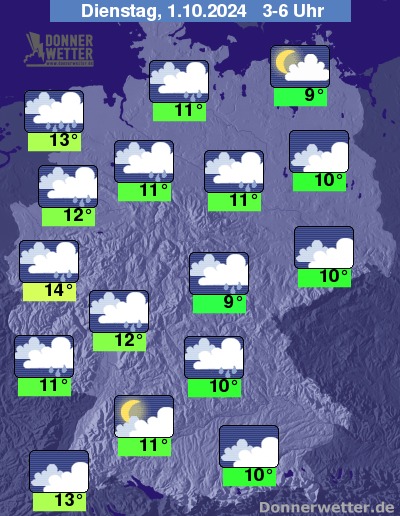 In der Nacht zum Dienstag zeigt sich der Himmel über weiten Landesteilen stark bewölkt oder bedeckt; dabei fällt im Norden Regen, auch in der Mitte teils schauerartig verstärkter Regen. Im äußeren Osten und Nordosten sowie südlich der Donau bleibt es überwiegend niederschlagsfrei.