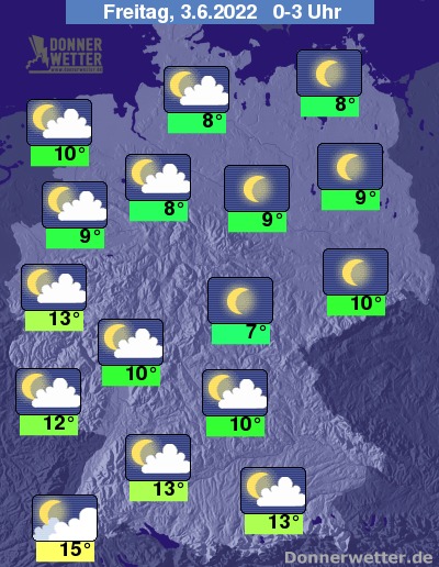 In der Nacht auf Freitag zeigt sich der Himmel über der Nord- und Osthälfte Deutschlands überwiegend sternenklar, im Süden und Westen ist es meist nur gering bewölkt. Schauer sind in der Nacht nicht zu erwarten.