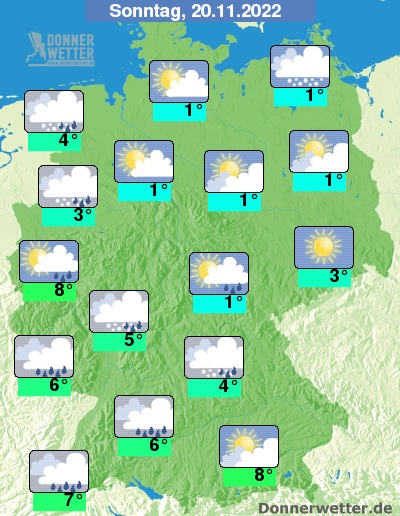 Am Sonntag ist es im Osten überwiegend heiter bis sonnig und dazu trocken. Im übrigen Land ist es stark verbreitet bis dicht bewölkt, dabei fällt hier und da Regen, Schneeregen oder Schnee. Die Temperatur steigt auf 1 Grad in Neubrandenburg und bis 8 Grad in München.