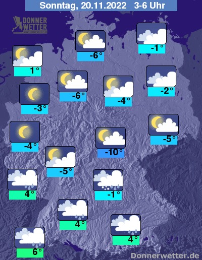 In der folgenden Nacht fällt im Süden unter dichten Wolken zeitweise Regen, Schneeregen oder Schnee. Auch im Ostseeumfeld bleibt es meist bedeckt und hier und da ist etwas Schneefall möglich. Im Osten ist es teils stark, teils aufgelockert bewölkt und trocken, sonst ist es meist locker bewölkt oder sternenklar und ebenfalls trocken. Die Temperatur sinkt auf 6 Grad in Freiburg und bis auf eisige -10 Grad in Jena.