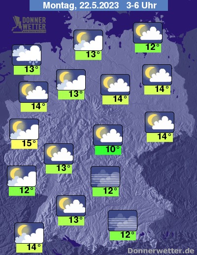 In der Nacht zum Montag bilden sich im Nordseeumfeld bei meist starker Bewölkung gebietsweise Schauer, sonst ist der Himmel meist nur locker bewölkt bis sternenklar. Hier und da ziehen auch mal einige Wolken durch, dazu bleibt es dann weitgehend trocken. Die Temperatur sinkt auf 15 Grad in Köln und bis etwa 10 Grad in Jena.