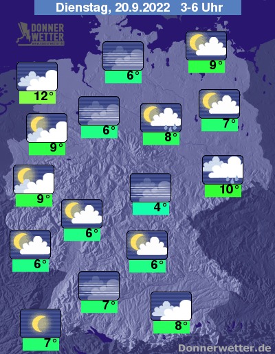 In der kommenden Nacht bilden sich im Südosten des Landes und über Sachsen weiterhin vielerorts Schauer, über der übrigen Osthälfte sind bei teils lockerer, teils starker Bewölkung nur vereinzelt Schauer zu erwarten. Im übrigen Land zeigt sich der Himmel meist locker bewölkt oder klar und dazu weitgehend trocken. Die Temperatur sinkt auf 12 Grad an der Nordsee und bis 4 Grad im Eichsfeld.