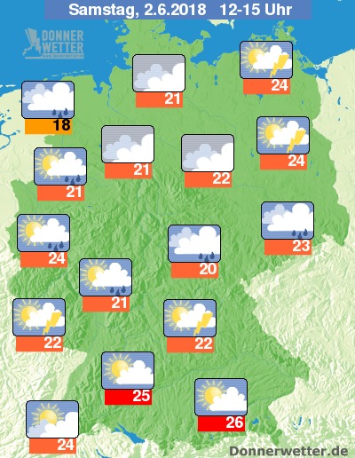 Heute Nachmittag ziehen häufig dichte Wolken übers Land hinweg. Besonders im Süden ist es aber auch über weite Strecken heiter und es bilden sich nur hier und da einzelne Schauer oder Gewitter. Im übrigen Land sind wiederholt Schauer und zum Teil auch starke Gewitter möglich. Die Temperatur liegt bei 18 Grad an der Nordsee und 26 Grad in München.