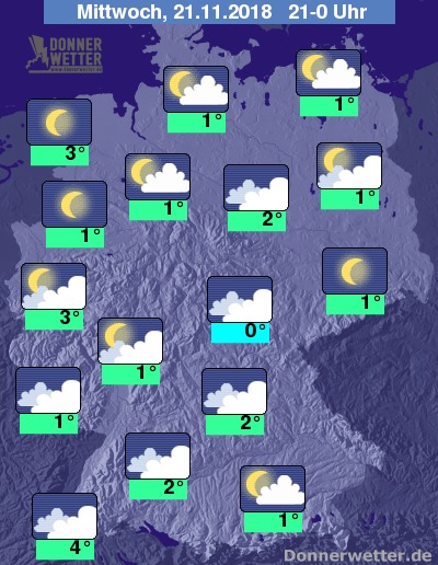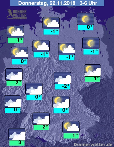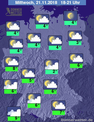 Die Temperaturen liegen vor Dämmerungsbeginn zwischen 2 und 6 Grad im Norden, sowie in der Mitte und 5 bis 9 Grad im Süden und Westen.