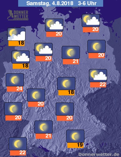 In der Nacht zum Samstag zeigt sich der Himmel meist sternenklar, im Nordwesten und im äußeren Norden ziehen alledings teils auch mal dichte Wolken heran, die jedoch keinen Regen bringen. Die Temperatur sinkt auf 24 Grad in Köln und bis auf 18 Grad am Niederrhein.