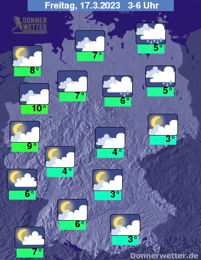 In der Nacht zum Freitag fällt nach Nordosten hin zunächst noch zeitweise Regen, der gegen Morgen jedoch abklingt. Im übrigen Land ist es verbreitet stark oder dicht bewölkt. Größere Auflockerungen sind vor allem im Südwesten möglich. Die Temperatur sinkt auf 10 Grad in Münster und bis 3 Grad in Nürnberg.