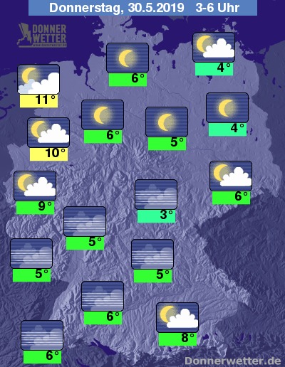 Bis zu den Frühstunden kühlt die Luft auf 3 Grad in den Mittelgebirgstälern und 11 Grad im Emsland ab.