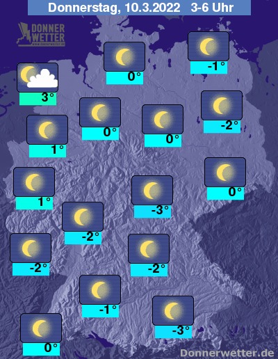 Die Temperaturen sinken im Nachtverlauf auf Werte um 3 Grad auf den ostfriesischen Inseln und -3 Grad am Alpenrand.