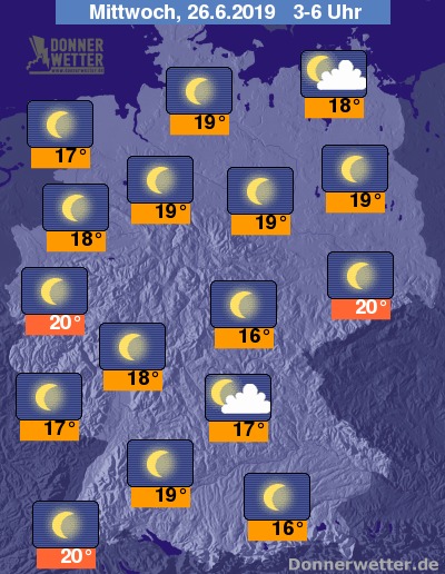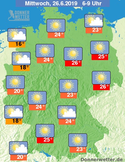 Die Temperaturen erreichen in den Frühstunden bereits Höchstwerte um 26 Grad in der Osthälfte.