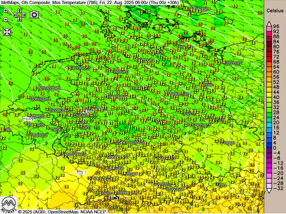 Strömungs- und Temperaturkarte Freitagmorgen nach GFS