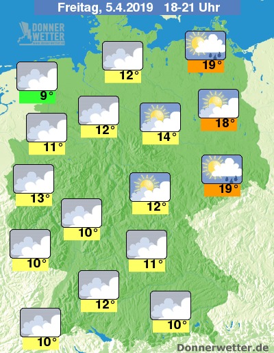 Am Abend entladen sich östlich der Elbe örtliche teils gewittrige Regengüsse. Sonst dominieren abgesehen einiger Lücken die Wolken. Es bleibt aber meistens niederschlagsfrei.