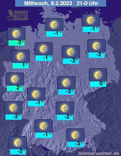 Hier bewegen sich die Lufttemperaturen auch am späteren Abend zumeist noch oberhalb der 0-Grad-Marke, in den übrigen Landesteilen leichter Luftfrost bei Werten meist um -1 bis -3 Grad.
