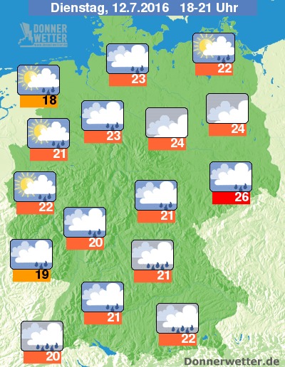 Heute Abend fällt im Süden bei dichter Bewölkung weiterhin teils ergiebiger und kräftiger Regen. Im Westen und Nordwesten sind neben starker Bewölkung und einzelnen Schauern und seltenen Gewittern auch heitere Abschnitte möglich. Im Rest der Republik ist es überwiegend stark bewölkt, dabei fällt gebietsweise auch Regen. Die Temperatur liegt bei etwa 18 Grad in Emden und um 26 Grad in Dresden.