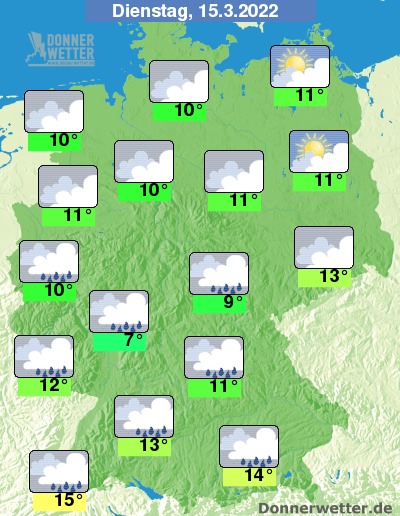 Am Dienstag bleibt der Himmel über weiten Landesteilen bedeckt oder es ist stark bewölkt; längere Auflockerungen beschränken sich heute vor allem auf den äußersten Osten und Nordosten Deutschlands. Im Süden, Westen und der Mitte fällt immer wieder teils anhaltender Regen, sonst bleibt es meist trocken.
