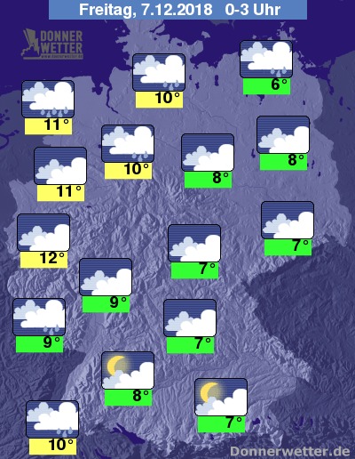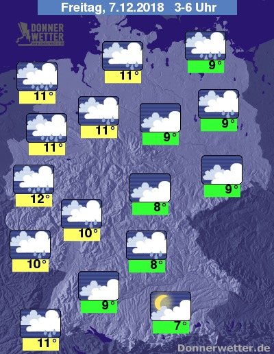 In der Nacht bleibt der Himmel über weiten Landesteilen dicht bewölkt oder bedeckt, entlang der Donau kann es phasenweise auch mal auflockern. Mit örtlichen Schauern muss zunächst vor allem im Nordwesten sowie an der Ostseeküste gerechnet werden, im weiteren Verlauf steigt das Schauerrisiko in der gesamten Westhälfte an. Der Wind aus West / Südwest frischt zudem spürbar auf, stellenweise können auch stürmische Böen auftreten.