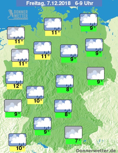 Die Temperaturen bleiben am Freitagmorgen mit Werten um 7 Grad C an den Alpen und um 12 Grad C in der Kölner Bucht sehr mild.