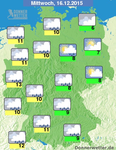 Heute ist es im Osten Deutschlands zunächst noch oft locker oder aufgelockert bewölkt und trocken, sonst ist der Himmel aber schon am Morgen weitgehend bedeckt und östlich einer Linie westlichstes Bayern bis in den Westen von Niedersachsen fällt zeitweise Regen, nach Osten hin ist es noch trocken. Im Tagesverlauf breitet sich das Regengebiet aber auch bis in die östlichsten Landesteile hin aus. Im Südwesten klingt der Regen in den Nachmittagsstunden dagegen weitgehend ab. Die Temperatur steigt auf 6 Grad in Vorpommern und bis auf milde 13 Grad im Rheinland.