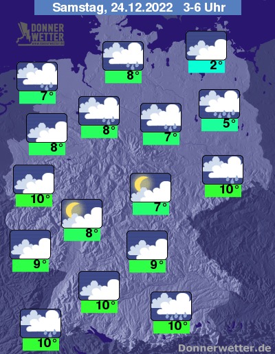 In der Nacht auf Heiligabend fällt im Norden und Osten sowie im Alpenvorland unter kompakter Bewölkung verbreitet und oft auch langanhaltend Regen. Im übrigen Bundesgebiet ist es auch meistens dicht, hier und da etwas aufgelockert bewölkt, dazu bleibt es weitgehend trocken. Die Temperatur sinkt auf 10 Grad in München und etwa 2 Grad in Rostock. Es weht ein oft starker bis stürmischer Wind.