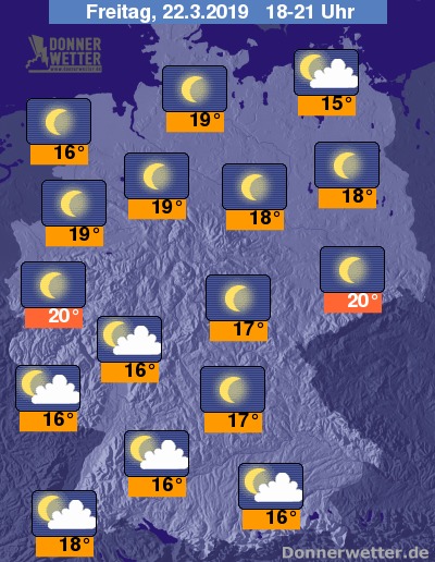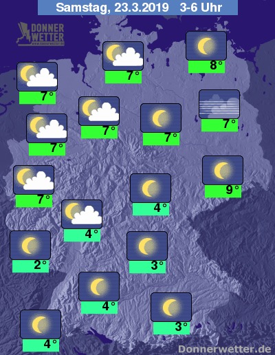 Bis zu den Frühstunden kühlt die Luft auf 2 bis 9 Grad ab. Am mildesten bleibt es dabei in Teilen von Sachsen und an der Ostseeküste. In Mittelgebirgstälern, sowie am Alpenrand kann es leichten Frost geben.