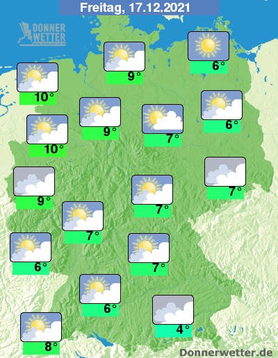Am Freitag ist das Wetter teils stark bewölkt oder trüb, teils zeigen sich auch Aufheiterungen, dabei bleibt es landesweit trocken. Die Temperatur steigt auf 4 Grad am bayerischen Alpenrand und bis 10 Grad entlang der Ems.