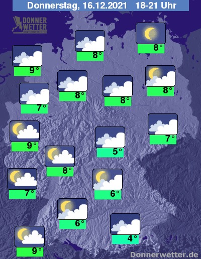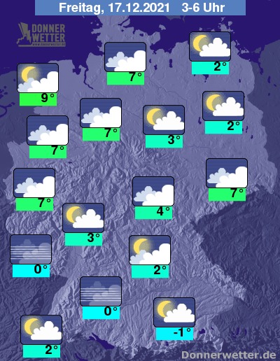 In der Nacht zum Freitag hält sich vor allem über der Nordhälfte oft dichte Bewölkung, vielerorts ist es aber auch nur locker bis wechselnd bewölkt. Es bildet sich stellenweise Nebel. Die Temperatur sinkt auf 9 Grad an der Nordsee und bis -1 Grad im Berchtesgadener Land.
