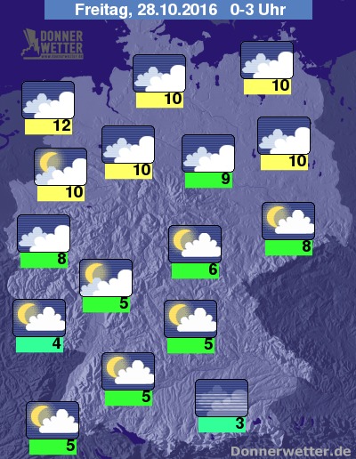Vor allem in der Südhälfte funkeln in der Nacht zu Freitag vielerorts die Sterne. Die Tiefstwerte sinken hier zum Teil auf unter 5 Grad, lokal bildet sich auch Nebel. Unter bedecktem Himmel liegen die Tiefsttemperaturen im Norden bei Werten um die 10 Grad.