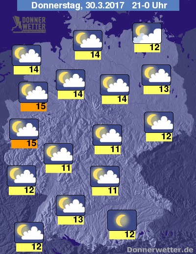 Am Donnerstag Abend zeigt sich das Wetter weitgehend über der kompletten Bundesrepublik klar. Keine Regenwolken in Sicht, was auf eine angenehme Nacht hinweist. Die Temperaturen liegen bei Werten zwischen 11 Grad C und 15 Grad C im Rheinland.